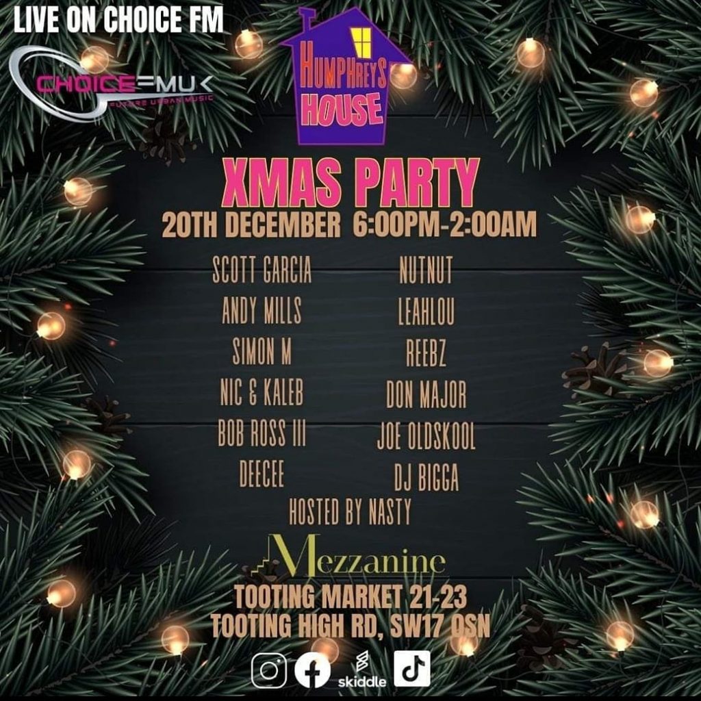 Humphrey’s House Christmas Party Extraveganza – Kicking off the night with a live broadcast from Mezzanine. DJs on the night: Scott Garcia, Andy Mills, Simon M, NIC & KALEB, Bob Ross III, DeeCee, NutNut, LeahLou, Reebz, Don Major, Joe Oldskool, DJ Bigga. Hosted by MC Nasty. https://www.skiddle.com/whats-on/London/Mezzanine/Humphreys-House/40415580/